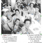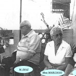 Pierrot rafraîchissait les coupes de cheveux de pas mal de jeunes du village, en autre, celle de Joseph PLAZA pas encore « WEBMASTER »,tout juste jeunot et de Gérard LAMBERT. A propos de Gérard, je vais faire la commère : figurez-vous qu’ il me racontait, un sourire au coin des lèvres, qu’il aimait bien ce salon , non pour la coupe impeccable, mais parce que c’était le seul endroit où il pouvait lire de A à Z tous les articles de l’ ÉQUIPE » et du « MIROIR-SPRINT ». Ah! Ces jeunes! Que voulez-vous? C’était une raison comme une autre d’aller chez son coiffeur. N’est-ce pas? Laissons nos amis patienter dans le salon en feuilletant les magazines et avançons dans notre promenade. Attention! Écartez-vous, laissez passer la noce. Madame STEPHEN marie sa fille Lucie. Suivons les invités, nous sommes entre amis. La famille STEPHEN demeurent dans cette cour. Justement Lucie et ses deux frères Gilbert et Denis nous accueillent amicalement. Les invités, prêts à acclamer les mariés, Lucie et Serge ROUMEGOUS, sont installés autour des grandes tables disposées dans la cour, rendant impossible l’accès aux portes de service de la banque, du salon de coiffure et du magasin de Nouveautés. La fête bat son plein. Mais le temps passe! Buvons à leur santé: « Tous nos vœux aux jeunes mariés! » Éclipsons nous discrètement.