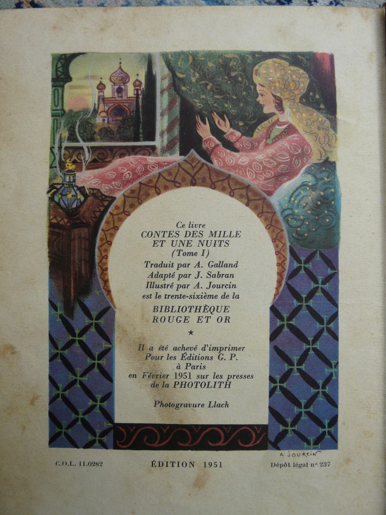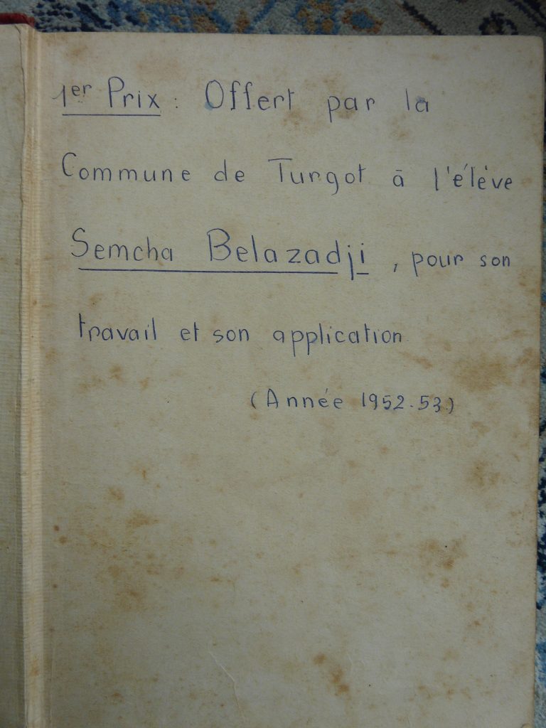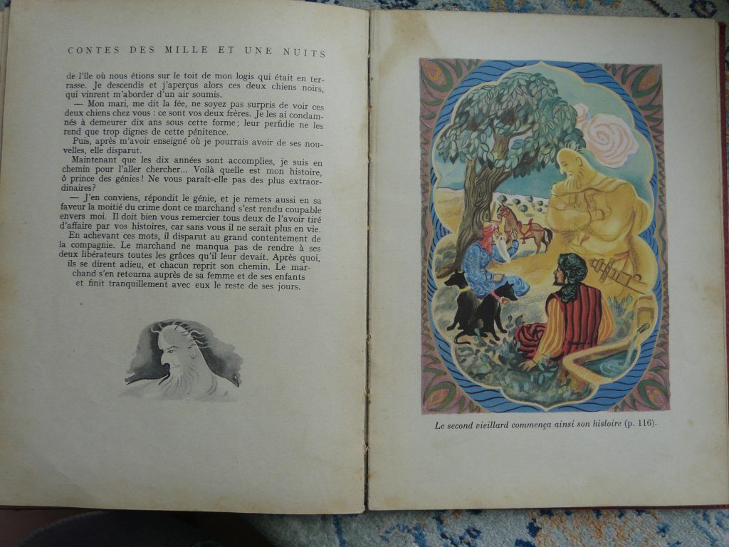 Et voilà ! Une bibliothèque a été vidée …et ce livre s’est retrouvé chez Emmaüs. Je n’ai pas résisté quand je l’ai découvert ! Son aspect délabré et sa couverture m’ont attirée ! Mais quelle surprise, un élève de Turgot l’a reçu en récompense d’une bonne année scolaire et cet élève, quelqu’un de l’amicale l’a peut-être connu…Je l’espère ! C’est pour cela que je partage ce livre avec vous. De toute évidence ce petit garçon a lui aussi traversé la Méditerranée avec son livre. En admettant que ce prix lui a été décerné autour de ses 10 ans, il doit avoir aujourd’hui 80 ans passés ou bien il n’est peut-être plus de ce monde. Quels sorts seront réservés à nos objets ? En tous cas, « Contes des Mille et une nuits », illustré, a trouvé une place dans ma bibliothèque où il attendait le bon moment pour se montrer à vous ! Colette.