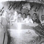 Bonsoir à vous tous. Je viens de consulter notre site (bravo Jo) et parmi toutes le photos une m’a interpellée. Il s’agit de celle représentant un groupe de jeunes hommes sous ce qui ressemble à une paillote et dont la devanture basse représente un crocodile gueule grande ouverte qui menace deux piroguiers.