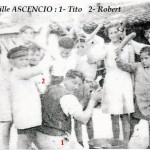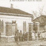 Essayons d’ avancer! A coté de la mercerie, la charcuterie de TITO, D’Auguste ASCENCIO plus exactement. Vous vous souvenez sans doute de son fils, ROBERT défilant sur le boulevard? Il en a fait tourner des têtes cet athlète lors des kermesses sportives organisées par M. CERNA! Ne rêvez pas! Retournons à la charcuterie! J’ai eu l’autre jour, une conversation téléphonique avec Flavien SEMPÉRÉ, le petit fils de M. SEMPERÉ le bourrelier, qui garde un affectueux souvenir de TITO. Rapprochez-vous, l’anecdote est touchante! Voyant la détresse de Flavien et de sa petite sœur qui venaient de perdre leur chien, TITO leur offrit pour les consoler deux petits porcelets à élever au biberon, qu’ils baptisèrent TIENT-TIENT et VIENT-VIENT. Le premier circulait dans la rue comme n’importe quel chien, il dut être abattu lors de l’épidémie de rage. Quand au second, il grandissait et grossissait comme n’importe quel goret. Et dans cette période où la disette due à la guerre se faisant sentir dans le village, ce fut un drame! TITO, lui-même, vint le transformer en boudin, pâté et saucissons. Malgré son grand désespoir, ses pleurs et ses regrets, Flavien ne put résister aux bonnes odeurs d’une côtelette grillée qu’il dévora la larme à l’œil. Ne le jugez pas sévèrement. Vous n’avez pas connu la guerre ni la faim! Triste histoire, je vous l’accorde. Avant de continuons notre balade, regardons les élèves jouer sur le trottoir, attendant l’heure de rentrer en classe.