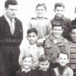 La cloche de l’école sonne, et tout ce petit monde ramasse en vitesse pignols. toupies, cartes et osselets qu’ils enfouissent dans la poche de leur « pantalon court ». Notre ami Gérard se rue vers l’école balançant son petit sac lourdement chargé, heurtant un bras, une jambe, comme par mégarde…dirons-nous. Sa victoire l’a un peu excité. M. CONTRERAS, son instituteur, aura fort à faire avec ce garçon! Ne vous inquiétez pas, le maître a une méthode radicale pour faire tenir en place le loustic!