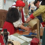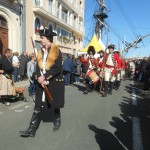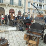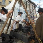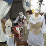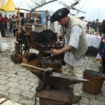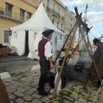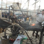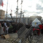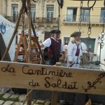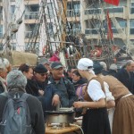 Sur un foyer improvisé, la soupe cuit. Plus loin, les cantinières vantent les bienfaits de la MARQUISETTE. Entre-nous soit dit, Danielle la réussit bien mieux. Jacques peut le confirmer. En continuant notre balade, nous apercevons le forgeron martelant avec énergie l’enclume, forgeant un clou  à tête plate une lettre en son centre, que vous pouvez acquérir. Dans la même échoppe, des demoiselles préparent des crèpes au sarrasin. Tandis que d’autres, toujours sorties des années 1790, lavent des écuelles dans des cuves en bois. Au bord du quai, quatre musiciens débarqués d’une goélette ou d’un galion, jouent un air d’antan.