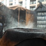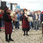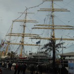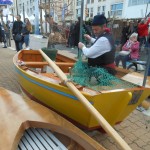 Eloignons-nous du bord du quai, trop de monde! Cela devient dangereux! Nous voici en IRLANDE. Un vieil Irlandais, quelque peu somnolant, a près de lui une corbeille remplie de tourbe avec laquelle a été calfatée le petit esquif devant nous. Le temps d’admirer la coquille de noix, un nuage sentant la saumure, nous submerge. Nous sommes chez les harenguiers russes! La fumée sort  d’un fût recouvert d’un sac en toile de jute. Derrière lui, une guérite nous offre un surprenant spectacle : des rangées de harengs suspendus à des  tringles, s’enfument….Ces harengs saurs sont à votre disposition. Harengs, si vous êtes les premiers à les acquérir, maquereaux méditérranéens en saumure pour les derniers. Et là, le goût n’est pas le même, nous en avons fait les frais. Voyez là-bas, les cadets du bateau russe le KRUZENSHTERN, qui défilent. Et sur le quai, des matelots jouent des musiques du pays. Admirez  les échoppes de souvenirs. Elles nous offrent un choix considérable d’objets décorés, de casquettes et de poupées russes.